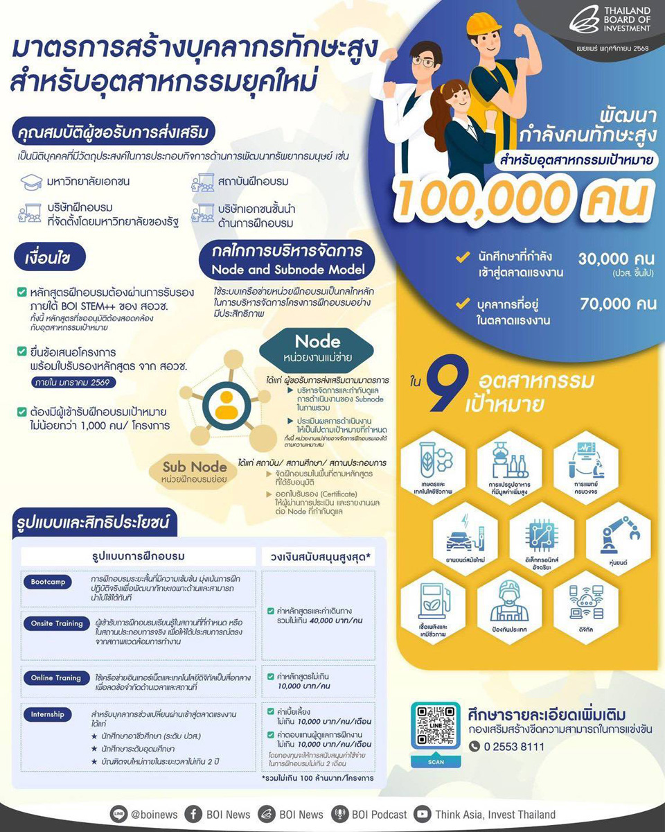 นอกจากนี้ ที่ประชุมยังได้รับทราบ มาตรการสร้างบุคลากรทักษะสูงสำหรับอุตสาหกรรมยุคใหม่ (Upskill & Reskill) ที่ตั้งเป้าพัฒนาบุคลากรจำนวน 100,000 คน แบ่งออกเป็นนักศึกษาที่เตรียมความพร้อมก่อนเข้าสู่ตลาดแรงงาน 30,000 คน และแรงงานที่ต้องการยกระดับหรือปรับเปลี่ยนทักษะ (Upskill & Reskill) 70,000 คน โดยการจัดอบรมและยกระดับทักษะแรงงานระดับ ปวส. ขึ้นไป ผ่านรูปแบบการฝึกอบรมทั้ง Bootcamp, การเรียนแบบ Onsite และ Online รวมถึงการฝึกปฏิบัติจริงในสถานประกอบการ โดยต้องยื่นคำขอภายในเดือนมกราคม 2569 และดำเนินการให้แล้วเสร็จภายใน 6 เดือนหลังออกบัตรส่งเสริม และ มาตรการสนับสนุนผู้ประกอบการไทยเพื่อเพิ่มขีดความสามารถในการแข่งขัน ที่จะให้เงินสนับสนุน 30–50% ของเงินลงทุนและค่าใช้จ่ายจริง สูงสุด 100 ล้านบาทต่อบริษัท สำหรับการยกระดับประสิทธิภาพธุรกิจด้วยเทคโนโลยีสมัยใหม่ การวิจัยและพัฒนา (R&D) และการปรับเปลี่ยนสู่ธุรกิจใหม่หรืออุตสาหกรรมสีเขียว โดยผู้ขอต้องเป็นนิติบุคคลที่มีสัดส่วนผู้ถือหุ้นไทยอย่างน้อย 51% ในอุตสาหกรรมเป้าหมาย ทั้งนี้ ต้องยื่นคำขอภายในเดือนมกราคม 2569 และดำเนินการให้แล้วเสร็จภายใน 12 เดือนหลังออกบัตรส่งเสริม