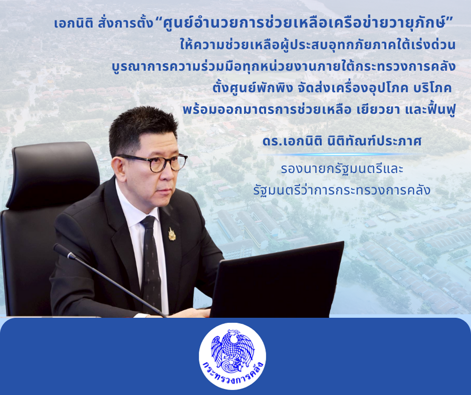ดร.เอกนิติ นิติทัณฑ์ประภาศ รองนายกรัฐมนตรีและรัฐมนตรีว่าการกระทรวงการคลัง สรุปนโยบายการให้ความช่วยเหลือผู้ประสบอุทกภัยในพื้นที่ภาคใต้ ว่า กระทรวงการคลังได้มีการตั้ง “ศูนย์อำนวยการช่วยเหลือเครือข่ายวายุภักษ์” เพื่อให้ความช่วยเหลืออย่างเร่งด่วนแก่ผู้ประสบอุทกภัยในภาคใต้ โดยบูรณาการความร่วมมือกับทุกหน่วยงานภายใต้สังกัดกระทรวงการคลัง โดยมอบหมายให้ นายลวรณ แสงสนิท ปลัดกระทรวงการคลัง เป็นประธานในการบูรณาการการปฏิบัติงาน ให้ทุกหน่วยงานในสังกัดนำกรอบการช่วยเหลือผู้ประสบภัย 3 ระยะ คือ “ช่วยเหลือ” “เยียวยา” และ “ฟื้นฟู” เร่งออกมาตรการให้ความช่วยเหลือประชาชนที่ได้รับผลกระทบจากอุทกภัยอย่างเป็นระบบ ตามขอบเขตความรับผิดชอบอย่างเต็มกำลัง โดยมีศูนย์อำนวยการช่วยเหลือเครือข่ายวายุภักษ์เป็นศูนย์กลางในการบริหารจัดการและติดตามสถานการณ์จากส่วนกลางอย่างใกล้ชิด