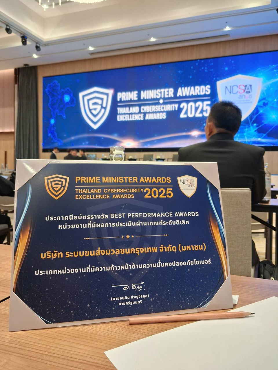 นางสาวอุษณีย์ นามศิริ ผู้จัดการฝ่ายเทคโนโลยีสารสนเทศ บริษัท ระบบขนส่งมวลชนกรุงเทพ จำกัด (มหาชน) ผู้ให้บริการรถไฟฟ้าบีทีเอส เป็นตัวแทนบริษัทฯ รับรางวัล Best Performance Awards หน่วยงานที่มีผลประเมินผ่านเกณฑ์ระดับดีเลิศ ประเภทหน่วยงานที่มีความก้าวหน้าด้านความมั่นคงปลอดภัยไซเบอร์ ในงาน Prime Minister Awards : Thailand Cybersecurity Excellence Awards 2025 ซึ่งจัดโดยสำนักงานคณะกรรมการการรักษาความมั่นคงปลอดภัยไซเบอร์แห่งชาติ (สกมช.) ณ โรงแรมแกรนด์ ริชมอนด์ สไตลิช คอนเวนชั่น โดยมี นายพิพัฒน์ รัชกิจประการ รองนายกรัฐมนตรี และรัฐมนตรีว่าการกระทรวงคมนาคม เป็นประธานในการมอบรางวัล