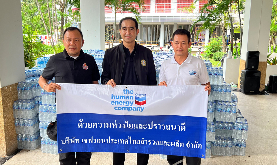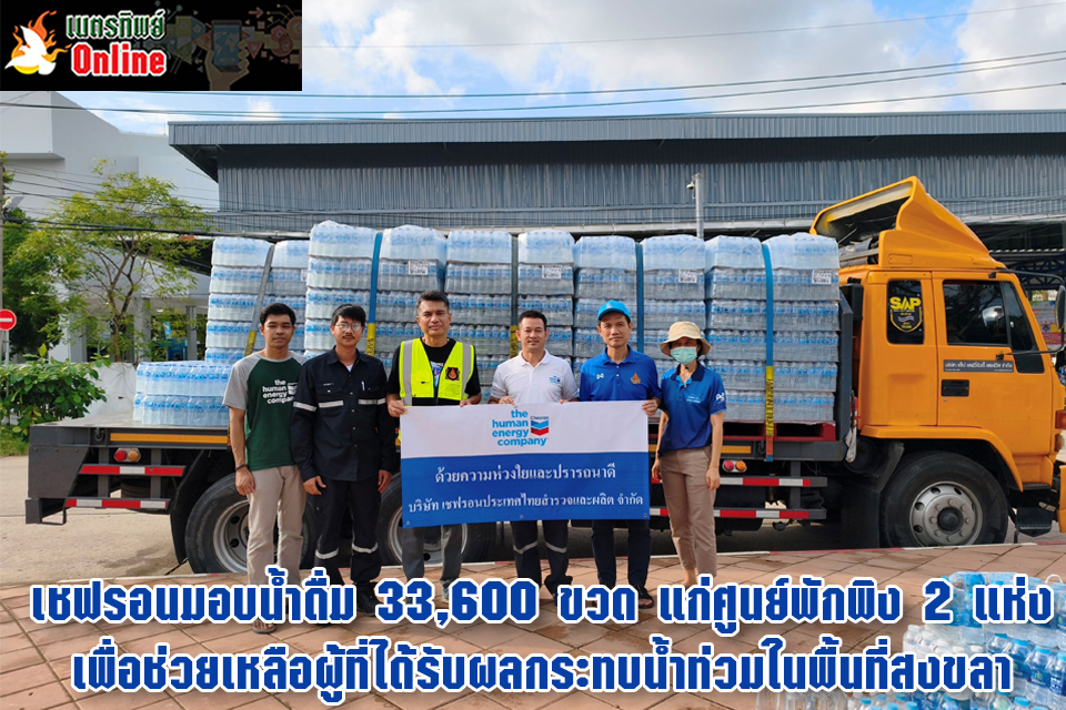 บริษัท เชฟรอนประเทศไทยสำรวจและผลิต จำกัด ส่งมอบน้ำดื่มจำนวน 33,600 ขวด แก่ศูนย์พักพิง 2 แห่ง ในจังหวัดสงขลา ได้แก่ ศูนย์พักพิงโรงพยาบาลสงขลานครินทร์ และศูนย์พักพิงมหาวิทยาลัยราชภัฎสงขลา เพื่อนำไปช่วยเหลือผู้ประสบภัยและผู้ที่ได้รับผลกระทบจากอุทกภัยในจังหวัดสงขลา