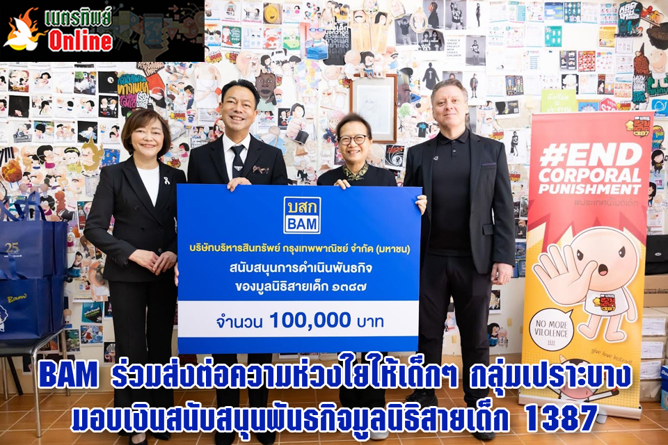 ดร.รักษ์ วรกิจโภคาทร ประธานเจ้าหน้าที่บริหาร บริษัทบริหารสินทรัพย์ กรุงเทพพาณิชย์ จำกัด (มหาชน) หรือ BAM มอบเงินสนับสนุนพันธกิจ มูลนิธิสายเด็ก 1387 จำนวน 100,000 บาท โดยมี ดร.ธาริษา วัฒนเกส ประธานมูลนิธิฯ และคุณอิลยา สมิร์นอฟ ผู้อำนวยการมูลนิธิฯ เป็นผู้รับมอบ ณ สำนักงานมูลนิธิสายเด็ก BAM ยืนหยัดทำงานเพื่อสังคมอย่างต่อเนื่อง ตามนโยบาย CSR in Process ที่มุ่งสร้างคนและสังคมให้เข้มแข็ง เพื่อช่วยเหลือเด็กที่อยู่ในกลุ่มเปราะบาง ให้พวกเขาได้รับการเยียวยา เติบโตอย่างปลอดภัย มีศักดิ์ศรี และมีโอกาสร่วมเป็นส่วนหนึ่งของสังคมอย่างงดงาม