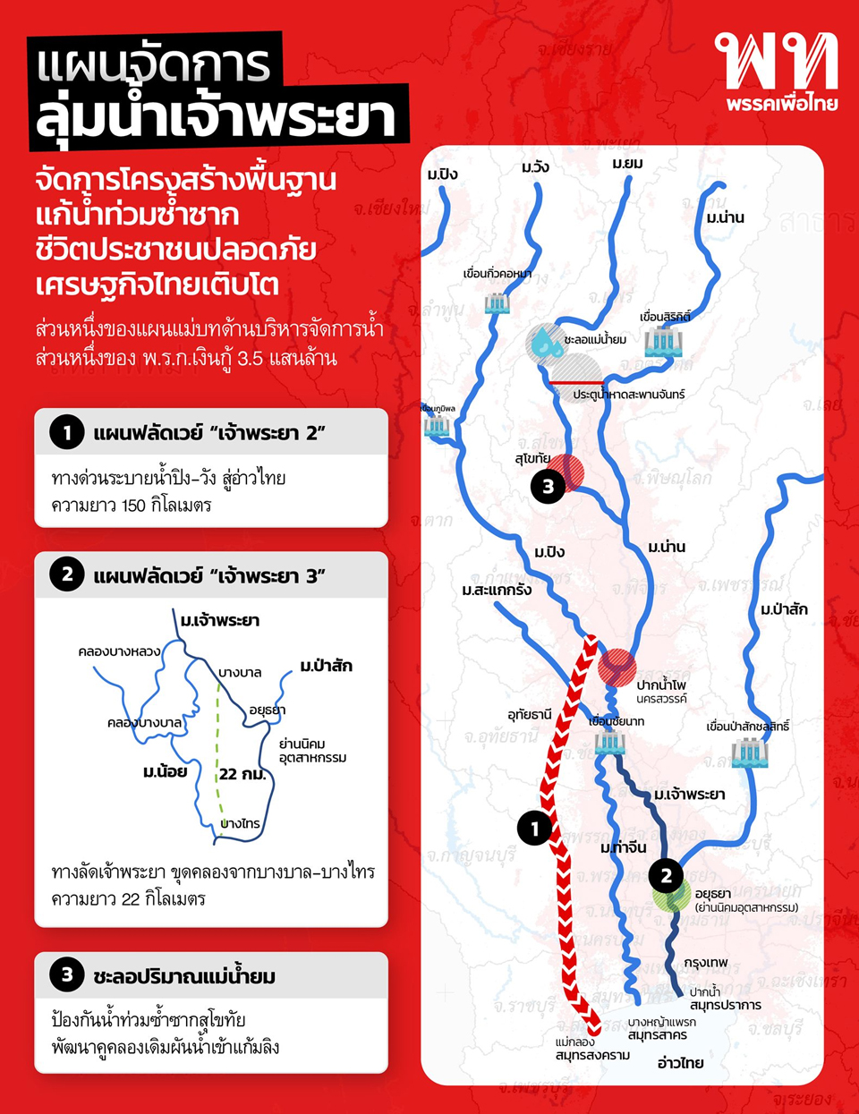 1. สร้างอ่างเก็บน้ำอย่างเหมาะสมและยั่งยืน ในพื้นที่ลุ่มน้ำปิง ยม น่าน สะแกกรัง และป่าสัก งบประมาณ 50,000 ล้านบาท