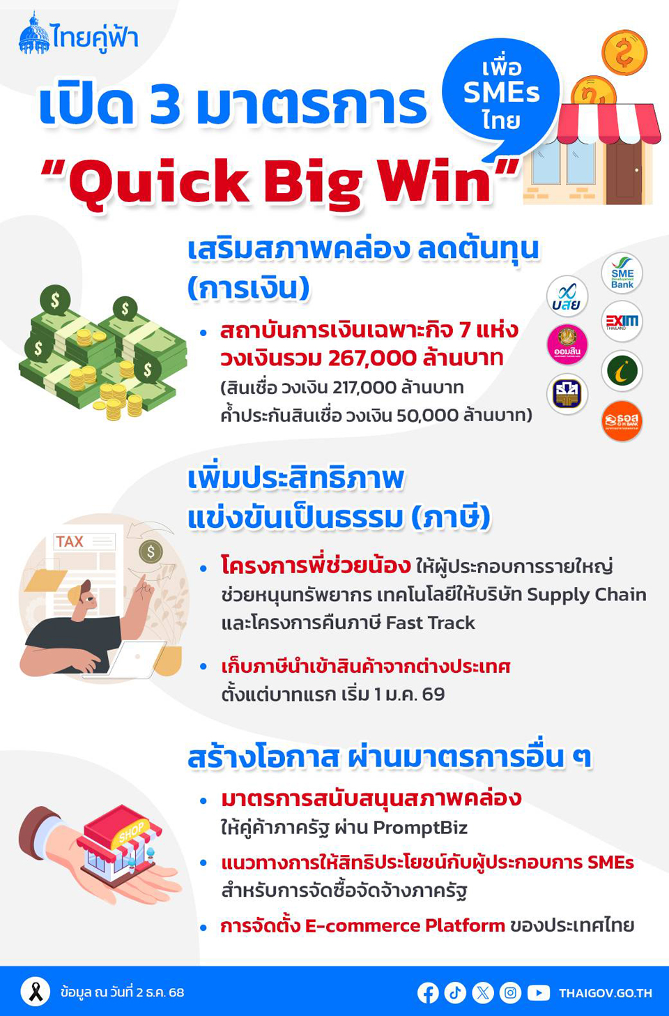 นายเอกนิติ นิติทัณฑ์ประภาศ รองนายกรัฐมนตรีและรัฐมนตรีว่าการกระทรวงการคลัง เปิดเผยว่า เพื่อขับเคลื่อนนโยบาย “Quick Big Win” โดยใช้หลัก “กระตุ้นสั้น ได้ผลยาว กระจายตัว” ภายใต้เสาหลักที่ 3 เพิ่มสภาพคล่องให้ผู้ประกอบการวิสาหกิจขนาดกลางและขนาดย่อม (Small and Medium Enterprises : SMEs) ให้สามารถฟื้นตัวและดำเนินธุรกิจต่อไปได้อย่างยั่งยืน ซึ่งจะส่งผลดีต่อระบบเศรษฐกิจโดยรวม ทั้งในด้านการจ้างงาน การสร้างรายได้ การลงทุน รวมถึงการเป็นห่วงโซ่อุปทานทำให้เกิดการเชื่อมโยงทางเศรษฐกิจที่สมดุล และเป็นแรงขับเคลื่อนระบบเศรษฐกิจโดยรวมให้เติบโตได้ในระยะยาว อย่างไรก็ดีปัจจุบันมีผู้ประกอบการ SMEs มากกว่าครึ่งที่ยังเข้าไม่ถึงแหล่งเงินทุนในระบบ ประกอบกับสินเชื่อที่หดตัวลงอย่างต่อเนื่อง รัฐบาลจึงมุ่งสร้าง Ecosystem ใหม่ ให้ผู้ประกอบการ SMEs ด้วยมาตรการ “Quick Big Win” เพื่อ SMEs ไทย ทั้งในด้านการเสริมสภาพคล่อง การเพิ่มประสิทธิภาพ และการสร้างโอกาสให้ผู้ประกอบการ SMEs ประกอบกับสถานการณ์อุทกภัยในพื้นที่ภาคใต้ที่เกิดขึ้นตั้งแต่ช่วงกลางเดือนพฤศจิกายน 2568 ซึ่งส่งผลกระทบเป็นวงกว้าง และซ้ำเติมความเปราะบางของผู้ประกอบการ SMEs รวมถึงการจ้างงานในพื้นที่ที่ได้รับผลกระทบ รัฐบาลจึงต้องเร่งเข้าช่วยเหลือเพื่อไม่ให้ภาคธุรกิจหยุดชะงัก โดยคณะรัฐมนตรีเมื่อวันที่ 2 ธันวาคม 2568 ได้มีมติเห็นชอบมาตรการ “Quick Big Win” เพื่อ SMEs ไทย ดังนี้