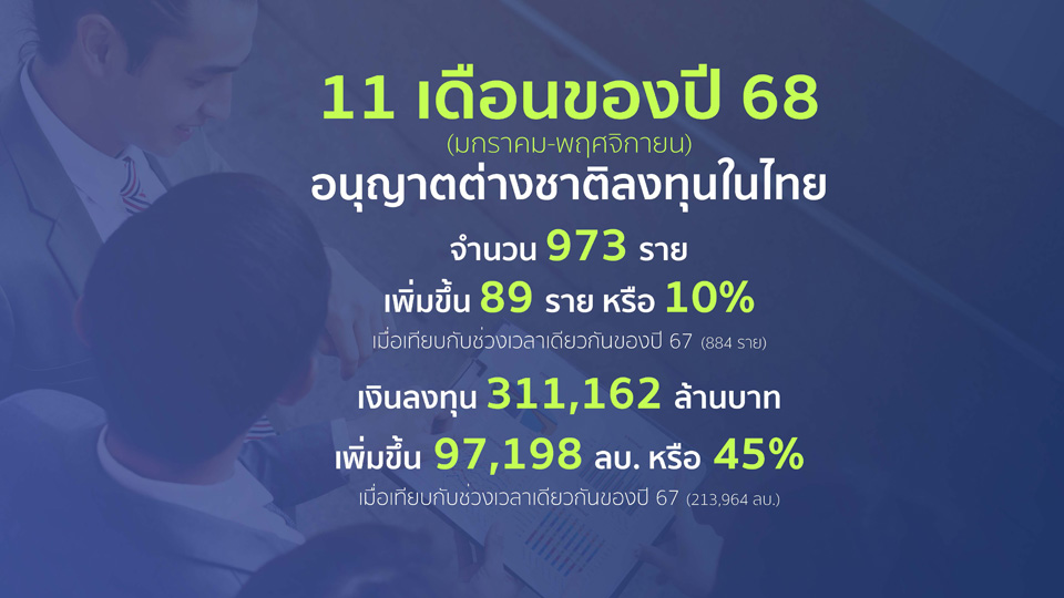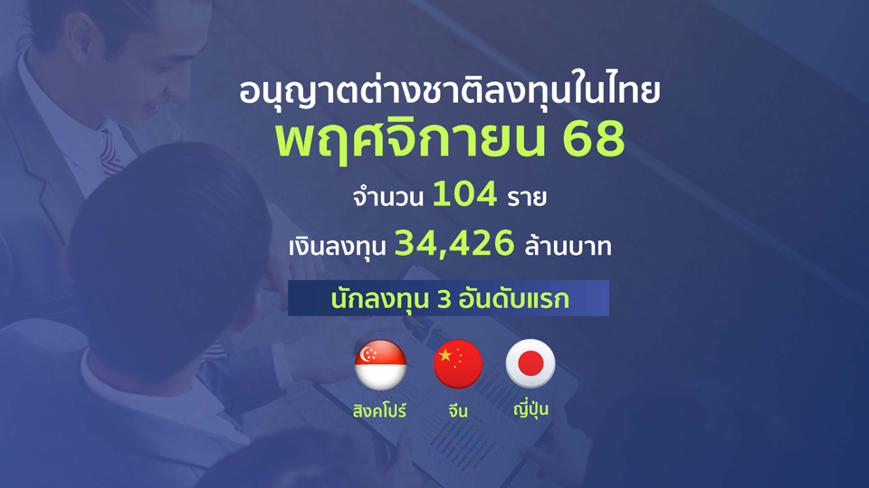 เฉพาะเดือนพฤศจิกายน 2568 มีการอนุญาตให้คนต่างชาติเข้ามาประกอบธุรกิจในประเทศไทย 104 ราย เป็นการลงทุนผ่านช่องทางการขอรับใบอนุญาตประกอบธุรกิจของคนต่างด้าว 35 ราย และการขอหนังสือรับรองการประกอบธุรกิจของคนต่างด้าว (ผ่านช่องทางการลงทุนตามกฎหมายว่าด้วยการส่งเสริมการลงทุน หรือได้รับอนุญาตตามกฎหมายว่าด้วยการนิคมอุตสาหกรรมแห่งประเทศไทย และการใช้สิทธิตามสนธิสัญญาหรือความตกลงระหว่างประเทศ) 69 ราย เงินลงทุนรวมทั้งสิ้น 34,426 ล้านบาท ส่วนใหญ่เป็นคนต่างชาติจาก สิงคโปร์ จีน และ ญี่ปุ่น ตามลำดับ