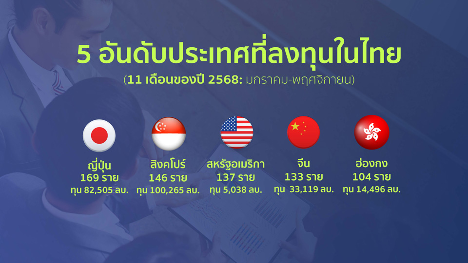 ส่อง 11 เดือนปี 68 ต่างชาติลงทุนในไทยสูงถึง 3.11 แสนล้านบาท เพิ่มขึ้นจาก 11 เดือนปี ‘67 ถึง 9.7 หมื่นล้านบาท หรือ 45% “สิงคโปร์” มีมูลค่าการลงทุนสูงอันดับหนึ่ง 100,265 ล้านบาท ตามด้วย “ญี่ปุ่น” 82,505 ล้านบาท และ “จีน” 33,119 ล้านบาท