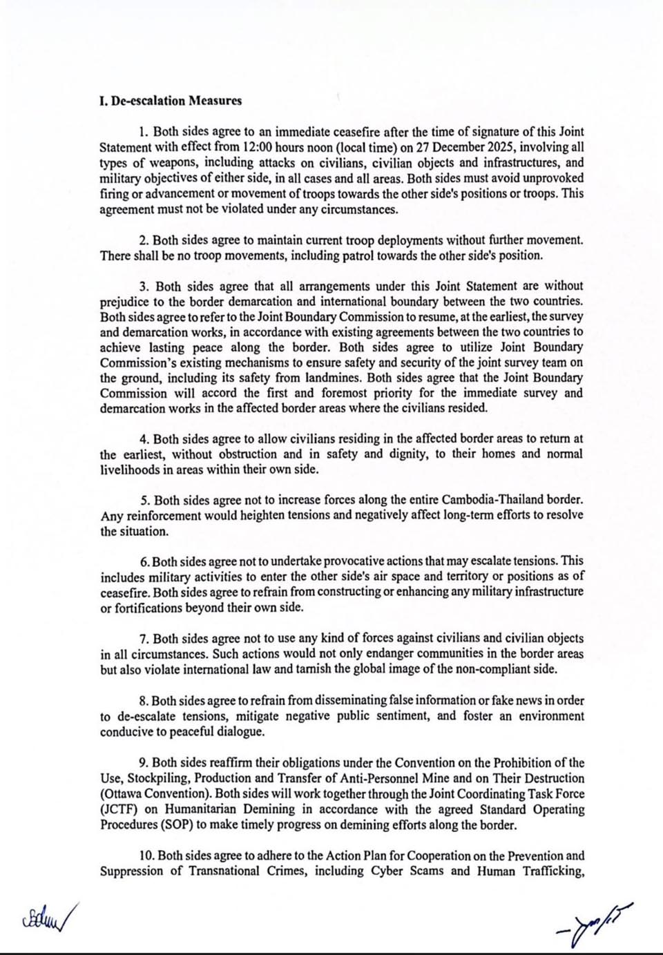 1. ทั้งสองฝ่ายตกลงให้มีการหยุดยิงโดยทันทีหลังจากเวลาที่มีการลงนามในแถลงการณ์ร่วมฉบับนี้ โดยให้มีผลตั้งแต่เวลา 00:00 น. (เที่ยงคืนเวลาท้องถิ่น) ของวันที่ 27 ธันวาคม 2025 ครอบคลุมอาวุธทุกประเภท รวมถึงการโจมตีต่อพลเรือน วัตถุพลเรือน และโครงสร้างพื้นฐาน ตลอดจนเป้าหมายทางทหารของฝ่ายใดฝ่ายหนึ่ง ในทุกกรณีและทุกพื้นที่ ทั้งสองฝ่ายต้องหลีกเลี่ยงการยิงโดยไม่มีการยั่วยุ การรุกคืบ หรือการเคลื่อนกำลังทหารไปยังที่ตั้งหรือกำลังของอีกฝ่ายหนึ่ง ข้อตกลงนี้จะต้องไม่ถูกละเมิดไม่ว่าในกรณีใด ๆ