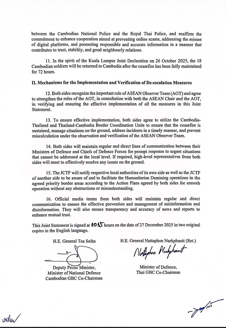 11. ภายใต้จิตวิญญาณของแถลงการณ์ร่วมกรุงกัวลาลัมเปอร์ เมื่อวันที่ 26 ตุลาคม 2025 ทหารกัมพูชาจำนวน 18 นาย จะถูกส่งตัวกลับประเทศกัมพูชา หลังจากการหยุดยิงได้รับการปฏิบัติอย่างสมบูรณ์เป็นระยะเวลา 72 ชั่วโมง