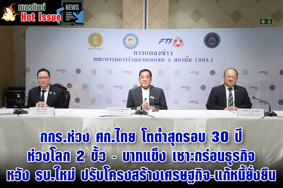 ผู้สื่อข่าวรายงานว่า เมื่อวันพุธที่ 7 มกราคม 2569 ดร.พจน์ อร่ามวัฒนานนท์ ประธานกรรมการหอการค้าไทยและสภาหอการค้าแห่งประเทศไทย เป็นประธานการแถลงข่าว คณะกรรมการร่วมภาคเอกชน 3 สถาบัน (กกร.) โดยมี นายเกรียงไกร เธียรนุกุล ประธานสภาอุตสาหกรรมแห่งประเทศไทย (ส.อ.ท.) และ นายผยง ศรีวณิช ประธานสมาคมธนาคารไทย ร่วมในการแถลงข่าว ณ ศูนย์การประชุมแห่งชาติสิริกิติ์ โดยระบุว่า…