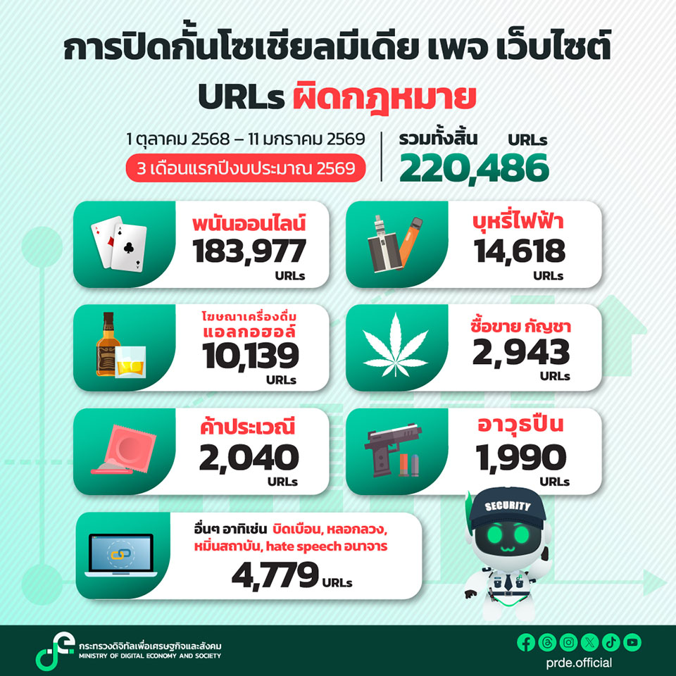นายเวทางค์ กล่าวว่า ในระหว่างวันที่ 1 ตุลาคม 2568 – 11 มกราคม 2569 กระทรวงดีอี ได้ดำเนินการปิดกั้นโซเชียลมีเดีย เพจ และเว็บไซต์ URLs ผิดกฎหมายแล้วจำนวน 220,486 รายการ เฉพาะเดือนธันวาคม 2568 เดือนเดียว สามารถปิดกั้น URLs ผิดกฎหมายได้มากถึง 116,397 รายการ