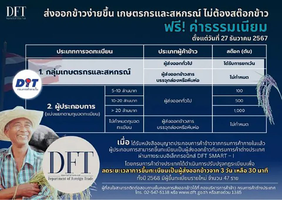 1. ลดระยะเวลาการขึ้นทะเบียนผู้ส่งออกข้าว จากเดิม 3 วัน เหลือเพียง 30 นาที ผ่านระบบอิเล็กทรอนิกส์ มีผลตั้งแต่วันที่ 27 ธ.ค.67