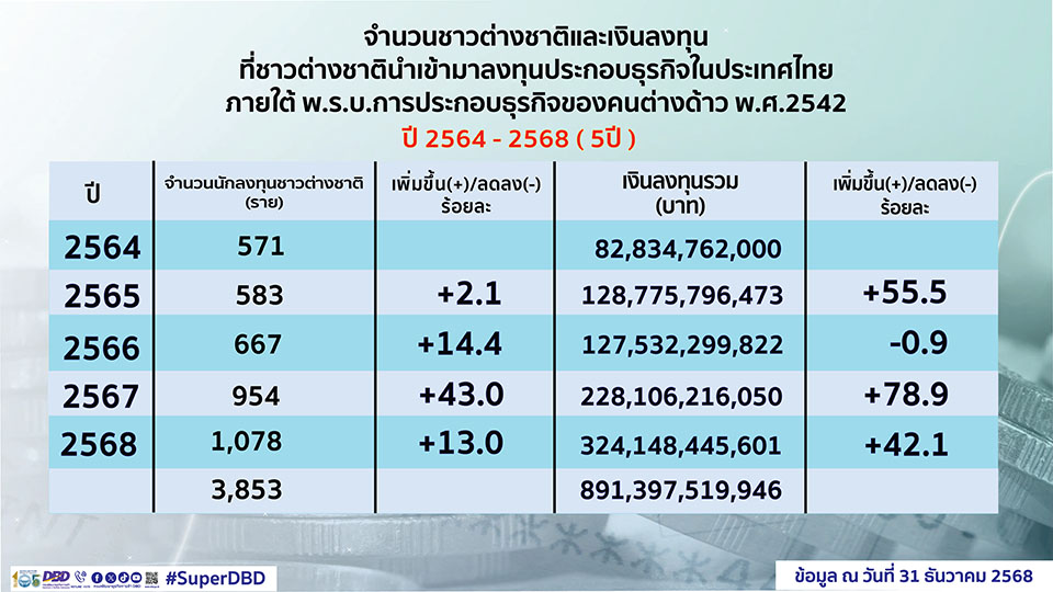 เฉพาะเดือนธันวาคม 2568 มีการอนุญาตให้คนต่างชาติเข้ามาประกอบธุรกิจในประเทศไทย 105 ราย เป็นการลงทุนผ่านช่องทางการขอรับใบอนุญาตประกอบธุรกิจของคนต่างด้าว 28 ราย และการขอหนังสือรับรองการประกอบธุรกิจของคนต่างด้าว (ผ่านช่องทางการลงทุนตามกฎหมายว่าด้วยการส่งเสริมการลงทุน หรือได้รับอนุญาตตามกฎหมายว่าด้วยการนิคมอุตสาหกรรมแห่งประเทศไทย และการใช้สิทธิตามสนธิสัญญาหรือความตกลงระหว่างประเทศ) 77 ราย เงินลงทุนรวมทั้งสิ้น 12,986 ล้านบาท ส่วนใหญ่เป็นคนต่างชาติจาก สิงคโปร์ จีน และ ญี่ปุ่น ตามลำดับ มีการจ้างงานคนไทยจากนักลงทุนที่ขอรับใบอนุญาตประกอบธุรกิจของคนต่างด้าว 929 คน รวมถึงมีการถ่ายทอดเทคโนโลยีอันเป็นองค์ความรู้เฉพาะด้านโดยตรงจากประเทศผู้เข้ามาลงทุนให้แก่คนไทย เช่น องค์ความรู้เกี่ยวกับการทำงานของกังหันลม องค์ความรู้เกี่ยวกับการบำรุงรักษาอุปกรณ์ผลิตไฟฟ้า และองค์ความรู้เกี่ยวกับกระบวนการอบชุบทางความร้อน เป็นต้น