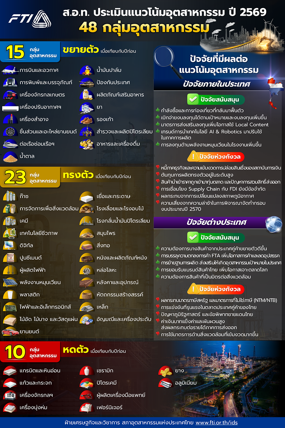 ทั้งนี้ ปี 2569 นับเป็นอีกหนึ่งปีที่ภาคอุตสาหกรรมไทยยังคงเผชิญกับความเปราะบางจากปัจจัยท้าทายทั้งภายในและภายนอกประเทศ ภาคเอกชนจึงมีความจำเป็นต้องเร่งวางแผนและปรับตัวอย่างรอบด้าน เพื่อรับมือกับความไม่แน่นอนที่อาจเกิดขึ้นในระยะข้างหน้า ขณะเดียวกัน ช่วงเวลาดังกล่าวยังถือเป็นจังหวะสำคัญในการวางรากฐานการเปลี่ยนผ่านเชิงโครงสร้างของภาคอุตสาหกรรมและระบบเศรษฐกิจ เพื่อขับเคลื่อนเศรษฐกิจไทยให้สามารถก้าวข้ามข้อจำกัดเดิม และปรับตัวให้สอดคล้องกับกระแสการเปลี่ยนแปลงของโลกที่เกิดขึ้นอย่างรวดเร็วและต่อเนื่อง