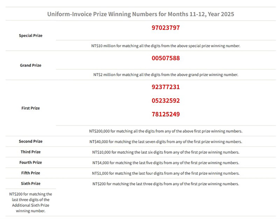ประกาศหมายเลขที่ถูกรางวัลล่าสุด (https://focustaiwan.tw/business/202601250007) สำหรับการจับสลากประจำเดือนพฤศจิกายน-ธันวาคม 2568 ในวันที่ 25 มกราคม 2569 ไต้หวันประกาศหมายเลขที่ถูกรางวัลสำหรับการจับสลากใบแจ้งหนี้แบบเดียวกันประจำเดือนพฤศจิกายน-ธันวาคมในวันอาทิตย์ โดยหมายเลขรางวัลพิเศษมูลค่า 10 ล้านดอลลาร์ไต้หวัน (318,799 ดอลลาร์สหรัฐ) คือ 97023797 ตามรายงานของกระทรวงการคลัง (MOF)