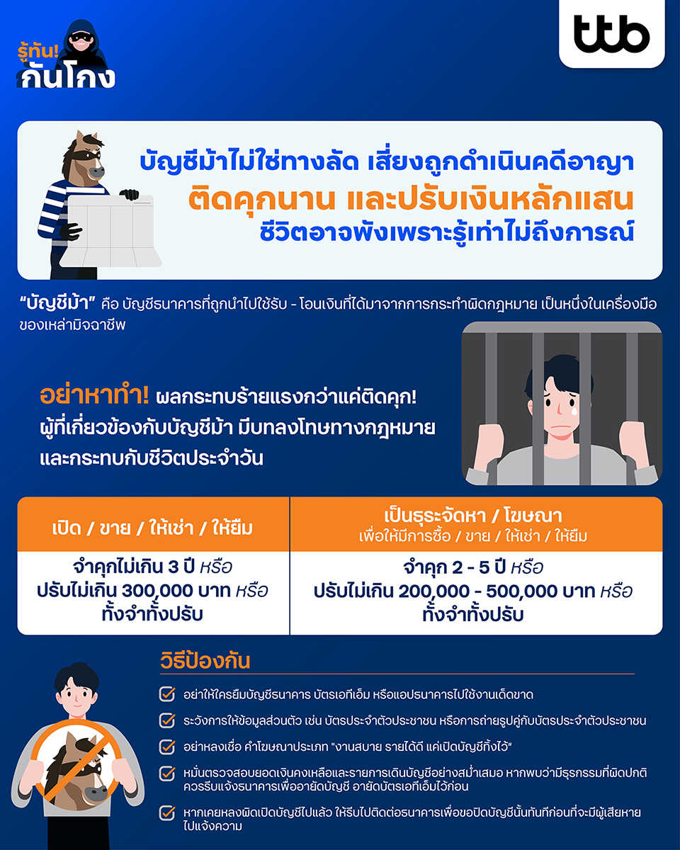 ทั้งนี้ หากพบการชักชวนให้เปิดบัญชีม้า ให้ปฏิเสธทันที หากสงสัยว่าถูกหลอก หรือพบพฤติกรรมมิจฉาชีพ สามารถติดต่อ ttb contact center โทร. 1428 กด 03 เพื่อรับคำแนะนำและดำเนินการอย่างถูกต้องทันที เพราะการแจ้งเบาะแสและการไม่ตกเป็นเหยื่อ คือการร่วมมือกันสร้างระบบการเงินที่มั่นคง ปลอดภัย และยั่งยืนสำหรับทุกคน