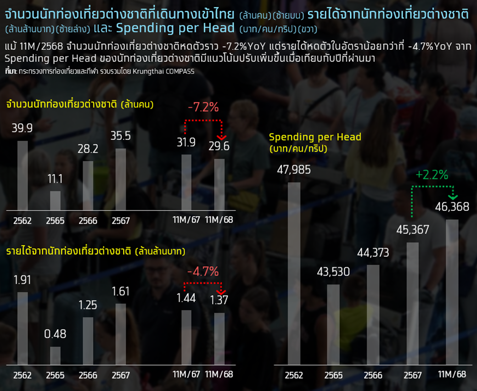 อย่างไรก็ดี รายได้จากนักท่องเที่ยวต่างชาติในช่วง 11M/2568 มีแนวโน้มหดตัวในอัตราน้อยกว่าจำนวนนักท่องเที่ยว โดยมีรายได้รวม 1.37 ล้านล้านบาท หดตัวลงราว -4.7%YoY จาก Spending per Head ของนักท่องเที่ยวต่างชาติที่ปรับเพิ่มขึ้นจากปีที่ผ่านมา ซึ่งเริ่มเห็นสัญญาณที่สอดคล้องกับยุทธศาสตร์ด้านการท่องเที่ยวของไทย ที่ต้องการมุ่งเน้นไปที่คุณภาพของนักท่องเที่ยวมากกว่าปริมาณ (Value over Volume)