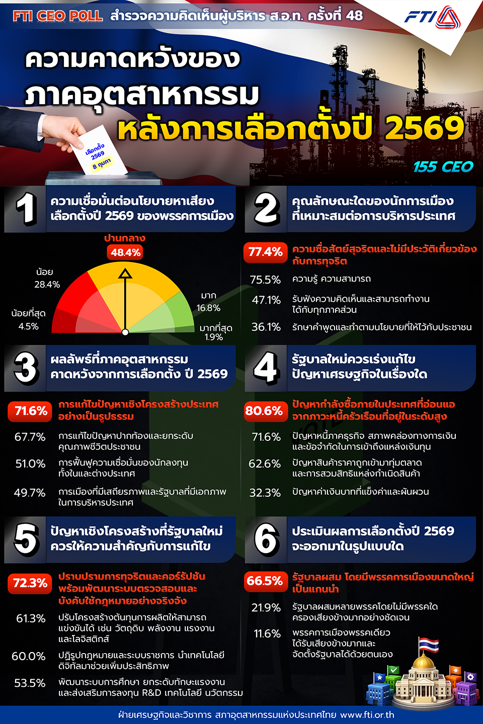 หม่อมหลวงปีกทอง ทองใหญ่ รองประธานสภาอุตสาหกรรมแห่งประเทศไทย (ส.อ.ท.) เปิดเผยผลการสำรวจ FTI CEO Poll ครั้งที่ 48 ประจำเดือนมกราคม 2569 ภายใต้หัวข้อ “ความคาดหวังของภาคอุตสาหกรรมหลังการเลือกตั้ง ปี 2569” ว่า ผู้บริหาร ส.อ.ท. ส่วนใหญ่ มีความเชื่อมั่นต่อนโยบายหาเสียงของพรรคการเมืองในการเลือกตั้งปี 2569 ว่าจะสามารถนำไปปฏิบัติได้จริงในระดับปานกลาง โดยให้ความสำคัญกับคุณลักษณะของนักการเมืองในด้านความซื่อสัตย์สุจริต ปราศจากประวัติการทุจริตเป็นอันดับแรก ขณะที่ผู้บริหาร ส.อ.ท. ยังประเมินว่า ผลการเลือกตั้งที่จะนำไปสู่การจัดตั้งรัฐบาลใหม่ มีแนวโน้มออกมาในรูปแบบรัฐบาลผสม โดยมีพรรคการเมืองขนาดใหญ่เป็นแกนนำในการจัดตั้งรัฐบาล