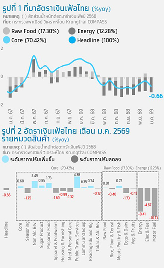 “ก้องภพ วงศ์แก้ว” กับ “กฤตตฤณ เหล่าฤทธิ์” นักวิเคราะห์ Krungthai Compass ระบุว่า.. อัตราเงินเฟ้อทั่วไปเดือน ม.ค. 69 ติดลบ 0.66% จากราคาพลังงานและกลุ่มผักสดที่ราคาปรับลง