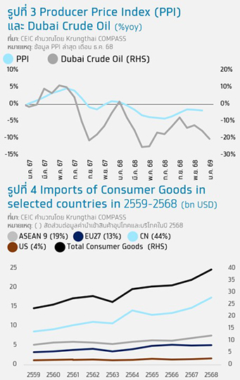 1) ต้นทุนการผลิตสินค้าที่ลดลงตามทิศทางราคาพลังงานที่จะต่ำกว่าปีที่ผ่านมา โดยสำนักบริหารสารสนเทศพลังงานสหรัฐ (EIA) ประเมินว่า อุปทานน้ำมันของโลกในปี 2569 จะยังล้นตลาดต่อไป เนื่องจาก OPEC+ และผู้ผลิตรายอื่นมีแนวโน้มที่จะผลิตน้ำมันเพิ่มขึ้นมากกว่าความต้องการ โดยทิศทางราคาพลังงานที่ต่ำจะช่วยให้ต้นทุนการผลิตลดลง โดยล่าสุดเห็นสัญญาณจากดัชนีราคาผู้ผลิต (PPI) ที่ปรับลดลงต่อเนื่องจากปีที่ผ่านมา (รูปที่ 3) นอกจากนี้ ราคาน้ำมันยังส่งผลให้ต้นทุนขนส่งลดลงอีกด้วย