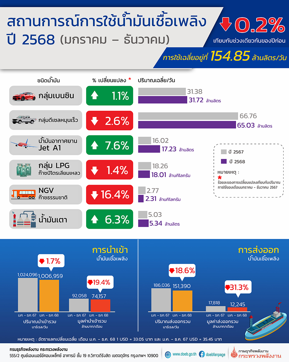 นายสราวุธ แก้วตาทิพย์ อธิบดีกรมธุรกิจพลังงาน เผยภาพรวมการใช้น้ำมันเชื้อเพลิงปี 2568 (มกราคม – ธันวาคม) มีปริมาณการใช้อยู่ที่ 154.85 ล้านลิตร/วัน ลดลงร้อยละ 0.2 เมื่อเทียบกับช่วงเดียวกันของปีก่อน โดยก๊าซธรรมชาติสำหรับยานยนต์ (NGV) มีปริมาณการใช้ลดลงสูงสุด ที่ร้อยละ 16.4 ตามด้วยน้ำมันดีเซลหมุนเร็วลดลงร้อยละ 2.6 และก๊าซปิโตรเลียมเหลว (LPG) ลดลงร้อยละ 1.4 ขณะที่น้ำมันอากาศยานเชิงพาณิชย์ (Jet A1) มีปริมาณการใช้เพิ่มขึ้นร้อยละ 7.6 การใช้น้ำมันเตาเพิ่มขึ้นร้อยละ 6.3 และกลุ่มเบนซินเพิ่มขึ้นร้อยละ 1.1 โดยมีรายละเอียดปริมาณการใช้น้ำมันเชื้อเพลิงแต่ละชนิดเมื่อเทียบกับช่วงเวลาเดียวกันของปีก่อน ดังนี้