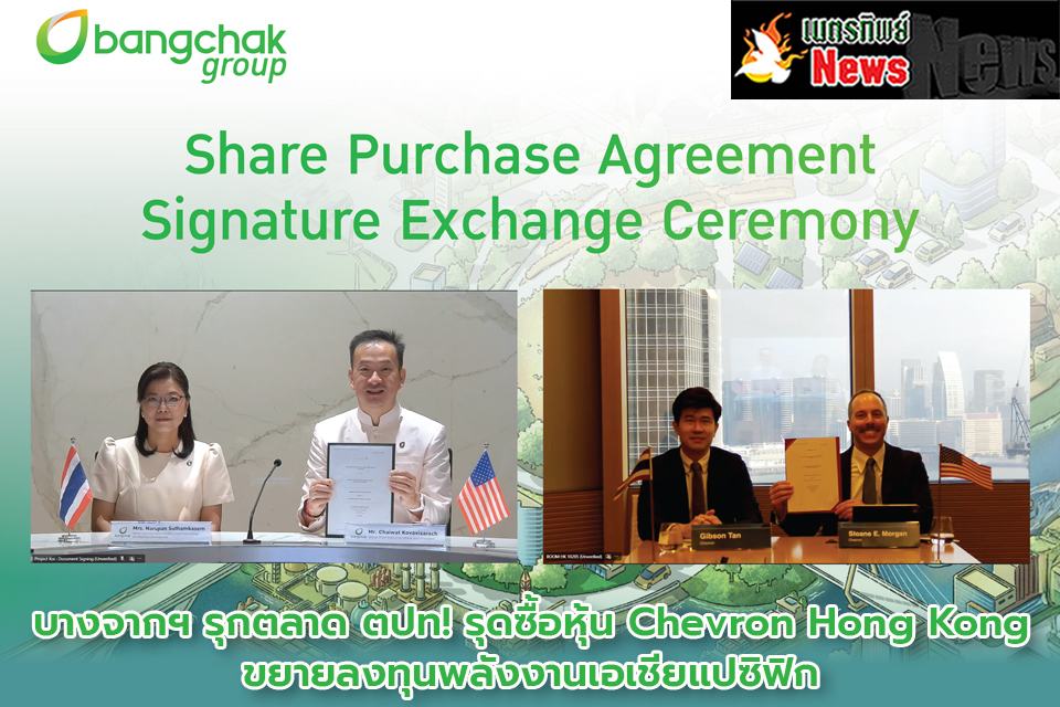 บริษัท บางจาก คอร์ปอเรชั่น จำกัด (มหาชน) ลงนามในสัญญาซื้อขายหุ้นกับบริษัท Chevron Companies (Greater China) Limited (“CCGC”) เพื่อเข้าถือหุ้นกิจการบริษัท Chevron Hong Kong Limited (“CHK”) ในสัดส่วน ร้อยละ 100 โดยมีนายชัยวัฒน์ โควาวิสารัช ประธานเจ้าหน้าที่บริหารกลุ่มบริษัทบางจาก และกรรมการผู้จัดการใหญ่ บริษัท บางจาก คอร์ปอเรชั่น จำกัด (มหาชน) เป็นผู้ลงนามในพิธีลงนามแบบออนไลน์ ร่วมกับ CCGC นับเป็นก้าวสำคัญของบางจากฯ ในการขยายธุรกิจพลังงานไทยสู่ตลาดต่างประเทศและการเตรียมความพร้อมด้านตลาดสำหรับธุรกิจโรงกลั่นน้ำมันในประเทศไทย โดยเฉพาะอย่างยิ่งการบริหารกำลังการกลั่นของกลุ่มบริษัทบางจากในระยะยาว