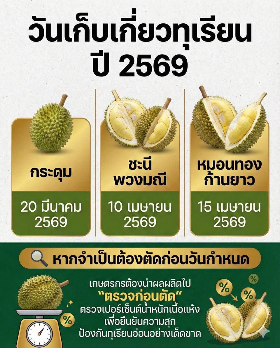 โดยคาดว่าจะเริ่มทยอยเก็บเกี่ยวทุเรียนพันธุ์กระดุมได้ตั้งแต่วันที่ 20 มีนาคม 2569 พันธุ์ชะนีและพวงมณีตั้งแต่วันที่ 10 เมษายน 2569 และพันธุ์หมอนทองรวมถึงพันธุ์ก้านยาว ตั้งแต่วันที่ 15 เมษายน 2569 เป็นต้นไป ทั้งนี้ หากเกษตรกรมีความจำเป็นต้องเก็บเกี่ยวก่อนวันที่กำหนด ต้องนำผลผลิตเข้ารับการ “ตรวจก่อนตัด” โดยตรวจวัดเปอร์เซ็นต์น้ำหนักเนื้อแห้ง เพื่อยืนยันความสุกของผลผลิต และป้องกันการตัดทุเรียนอ่อนอย่างเด็ดขาด