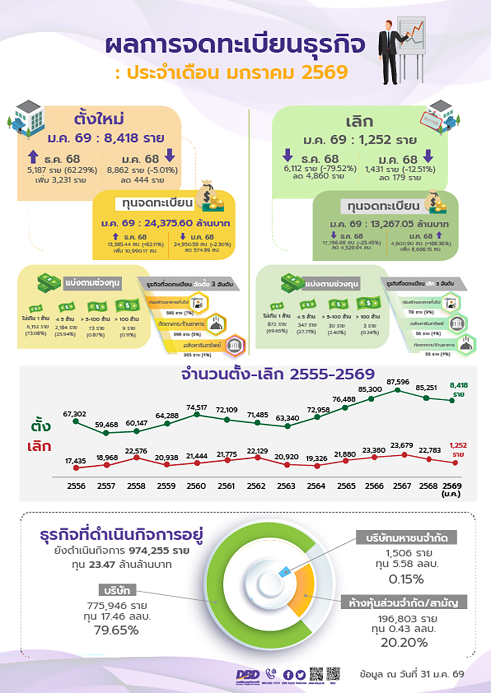 ทั้งนี้ มีนิติบุคคลที่มีทุนจดทะเบียนเลิกประกอบกิจการเกิน 1,000 ล้านบาท จำนวน 1 ราย คือ บริษัท พิษณุโลก บิ๊กซี 2015 จำกัด ทุนจดทะเบียน 10,478 ล้านบาท ประกอบธุรกิจดิสเคาท์สโตร์ ซุปเปอร์เซ็นเตอร์ (ข้อมูล ณ วันที่ 31 มกราคม 2569) พบว่า มีธุรกิจที่จดทะเบียนนิติบุคคลรวมทั้งสิ้น 2,058,497 ราย ทุนจดทะเบียนรวม 31.95 ล้านล้านบาท โดยมีนิติบุคคลดำเนินกิจการอยู่ 974,255 ราย ทุนจดทะเบียนรวม 23.47 ล้านล้านบาท แบ่งเป็นบริษัทจำกัด 775,946 ราย คิดเป็น 79.65% ของจำนวนนิติบุคคลที่ดำเนินกิจการอยู่ทั้งหมด ทุนจดทะเบียนรวม 17.46 ล้านล้านบาท ห้างหุ้นส่วนจำกัดและห้างหุ้นส่วนสามัญนิติบุคคล 196,803 ราย คิดเป็น 20.20% ของจำนวนนิติบุคคลที่ดำเนินกิจการอยู่ทั้งหมด ทุนจดทะเบียนรวม 0.43 ล้านล้านบาท และบริษัทมหาชนจำกัด 1,506 ราย คิดเป็น 0.15% ของจำนวนนิติบุคคลที่ดำเนินกิจการอยู่ทั้งหมด ทุนจดทะเบียนรวม 5.58 ล้านล้านบาท