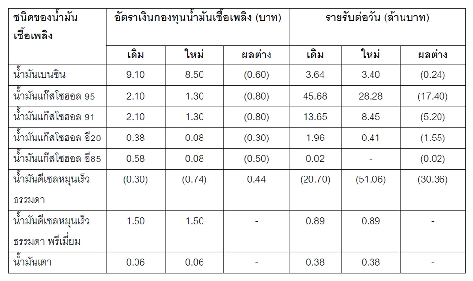 ปัจจุบัน ฐานะกองทุนนํ้ามันฯ ณ วันที่ 22 กุมภาพันธ์ 2569 กองทุนนํ้ามันฯ เป็นบวกอยู่ที่ 2,385 ล้านบาท แบ่งเป็น บัญชีนํ้ามันบวกอยู่ที่ 40,374 ล้านบาท และบัญชี LPG ติดลบอยู่ที่ 37,989 ล้านบาท ส่วนการปรับลดอัตราเงินส่งเข้ากองทุนนํ้ามันฯ ประเภทนํ้ามัน จะทำให้รายรับลดลงประมาณวันละ 54.77 ล้านบาท จากเดิ่มจากเดิมที่มีรายรับประมาณวันละ 45.52 ล้านบาท เป็นมีรายจ่ายประมาณวันละ 9.25 ล้านบาท (รายละเอียดในตาราง)