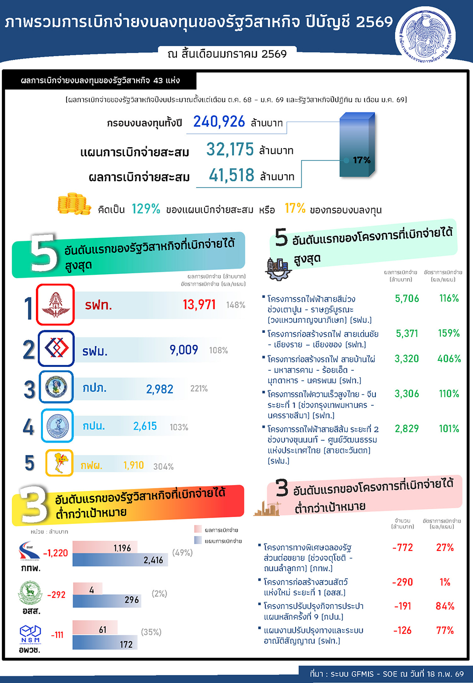 กลุ่มรัฐวิสาหกิจที่ใช้ปีบัญชีตามปีงบประมาณ (รัฐวิสาหกิจปีงบประมาณ) และกลุ่มรัฐวิสาหกิจที่ใช้ปีบัญชีตามปีปฏิทิน (รัฐวิสาหกิจปีปฏิทิน) โดยในปีบัญชี 2569 รัฐวิสาหกิจมีกรอบงบลงทุน จำนวน 240,926 ล้านบาท และมีผลการเบิกจ่ายสะสมจนถึงสิ้นเดือนมกราคม 2569 จำนวน 41,518 ล้านบาท หรือคิดเป็นร้อยละ 129 ของแผนการเบิกจ่ายสะสม ประกอบด้วยการเบิกจ่าย งบลงทุนของรัฐวิสาหกิจปีงบประมาณ (ตั้งแต่เดือนตุลาคม 2568 - เดือนมกราคม 2569) 34 แห่ง จำนวน 34,974 ล้านบาท หรือคิดเป็นร้อยละ 119 ของแผนการเบิกจ่ายสะสม และรัฐวิสาหกิจปีปฏิทิน (เดือนมกราคม 2569) 9 แห่ง จำนวน 6,544 ล้านบาท หรือคิดเป็นร้อยละ 233 ของแผนการเบิกจ่ายสะสม