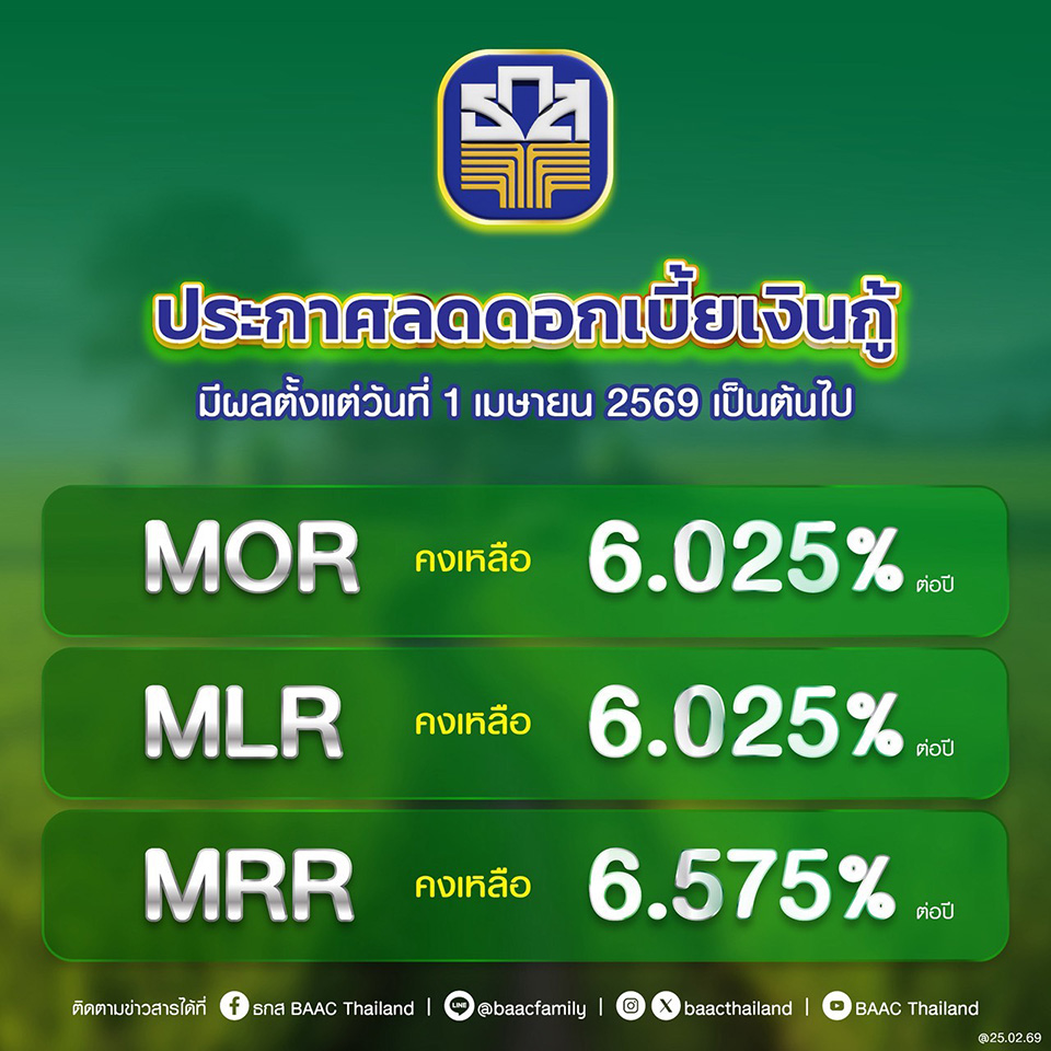 ขณะที่ ธ.ก.ส. ได้ประกาศลดดอกเบี้ยลงเช่นกัน (ดู Infographic) ทั้งนี้จะมีธนาคารแห่งอื่น ๆ เริ่มประกาศลดดอกเบี้ยลงเช่นกัน