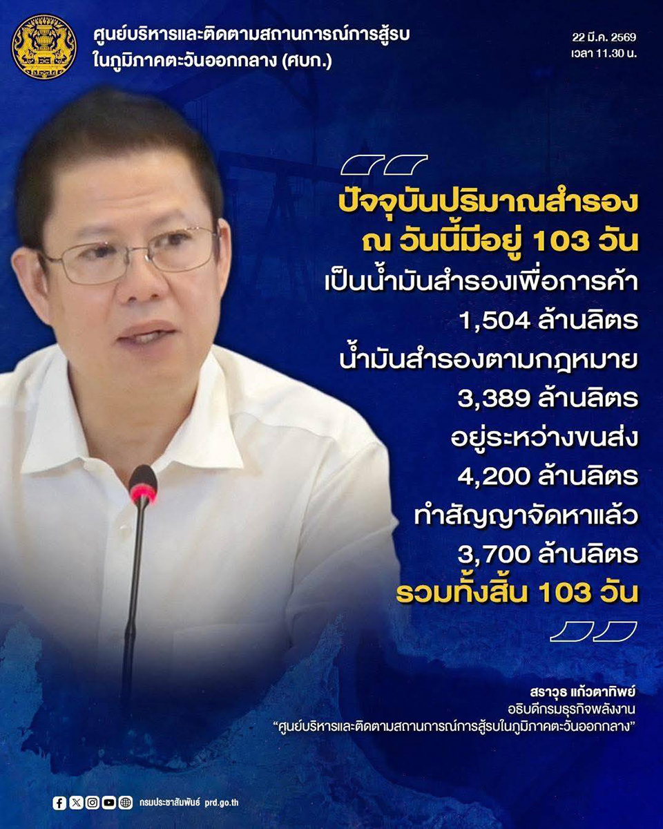 นายสราวุธ กล่าวย้ำว่า ปัจจุบันประเทศไทยมีปริมาณน้ำมันสำรองรวมเพียงพอต่อการใช้ 103 วัน แบ่งเป็นน้ำมันสำรองเพื่อการค้า 1,504 ล้านลิตร น้ำมันสำรองตามกฎหมาย 3,389 ล้านลิตร และปริมาณระหว่างขนส่ง 4,200 ล้านลิตร รวมถึงมีการทำสัญญาจัดหาไว้แล้ว 3,700 ล้านลิตร