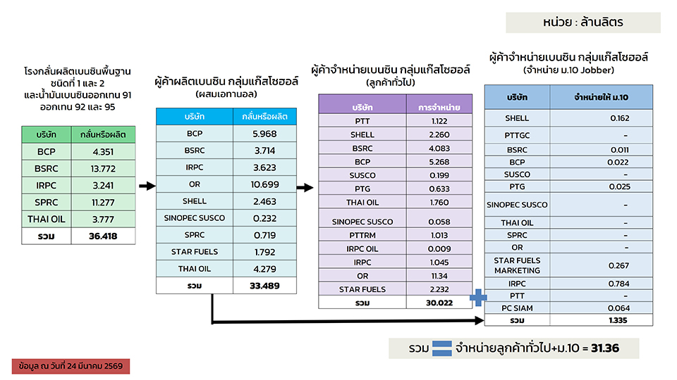 ส่วนที่ 3 การจําหน่ายให้กับผู้ค้าน้ำมันตามมาตรา 10 (Jobber) ปริมาณ 6.337 ล้านลิตร ซึ่งเมื่อรวมกับปริมาณที่จำหน่ายข้างต้น อยู่ที่ 79.42 ล้านลิตร เป็นปริมาณน้ำมันดีเซลที่จำหน่ายในประเทศ รวมทั้งสิ้น 85.757 ล้านลิตร (ณ 24 มีนาคม 2569)