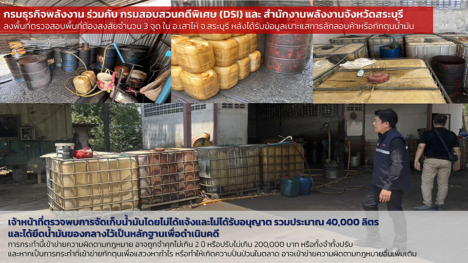 อีกทั้ง เมื่อวันที่ 21 – 23 มีนาคม 2569 ได้ลงพื้นที่ตรวจสอบคลังน้ำมันเพื่อสร้างความมั่นใจ ร่วมกับตำรวจนครบาล กรมสอบสวนคดีพิเศษ และกระทรวงพาณิชย์ รวมทั้งสิ้น 7 แห่ง ยังไม่พบความผิดปกติในเรื่องของการติดป้ายราคา และทุกแห่งมีปริมาณจ่ายน้ำมันในเดือนมีนาคม ใกล้เคียงหรือสูงกว่าเดือน มกราคม - กุมภาพันธ์ 2569 และเมื่อวันที่ 25 มีนาคม 2569 กรมธุรกิจพลังงาน ร่วมกับ กรมสอบสวนคดีพิเศษ และสำนักงานพลังงานจังหวัดสระบุรี ลงพื้นที่ตรวจสอบพื้นที่ต้องสงสัยจำนวน 3 จุดในอำเภอเสาไห้ จังหวัดสระบุรี หลังได้รับข้อมูลเบาะแสการลักลอบค้าหรือกักตุนน้ำมัน โดยเจ้าหน้าที่ตรวจพบการจัดเก็บน้ำมันโดยไม่ได้แจ้งและไม่ได้รับอนุญาต รวมประมาณ 40,000 ลิตร และได้ยึดน้ำมันของกลางไว้เป็นหลักฐานเพื่อดำเนินคดี การกระทำนี้เข้าข่ายความผิดตามกฎหมาย อาจถูกจำคุกไม่เกิน 2 ปี หรือปรับไม่เกิน 200,000 บาท หรือทั้งจำทั้งปรับ และหากเป็นการกระทำที่เข้าข่ายกักตุนเพื่อแสวงหากำไร หรือทำให้เกิดความปั่นป่วนในตลาด อาจเข้าข่ายความผิดตามกฎหมายอื่นเพิ่มเติม