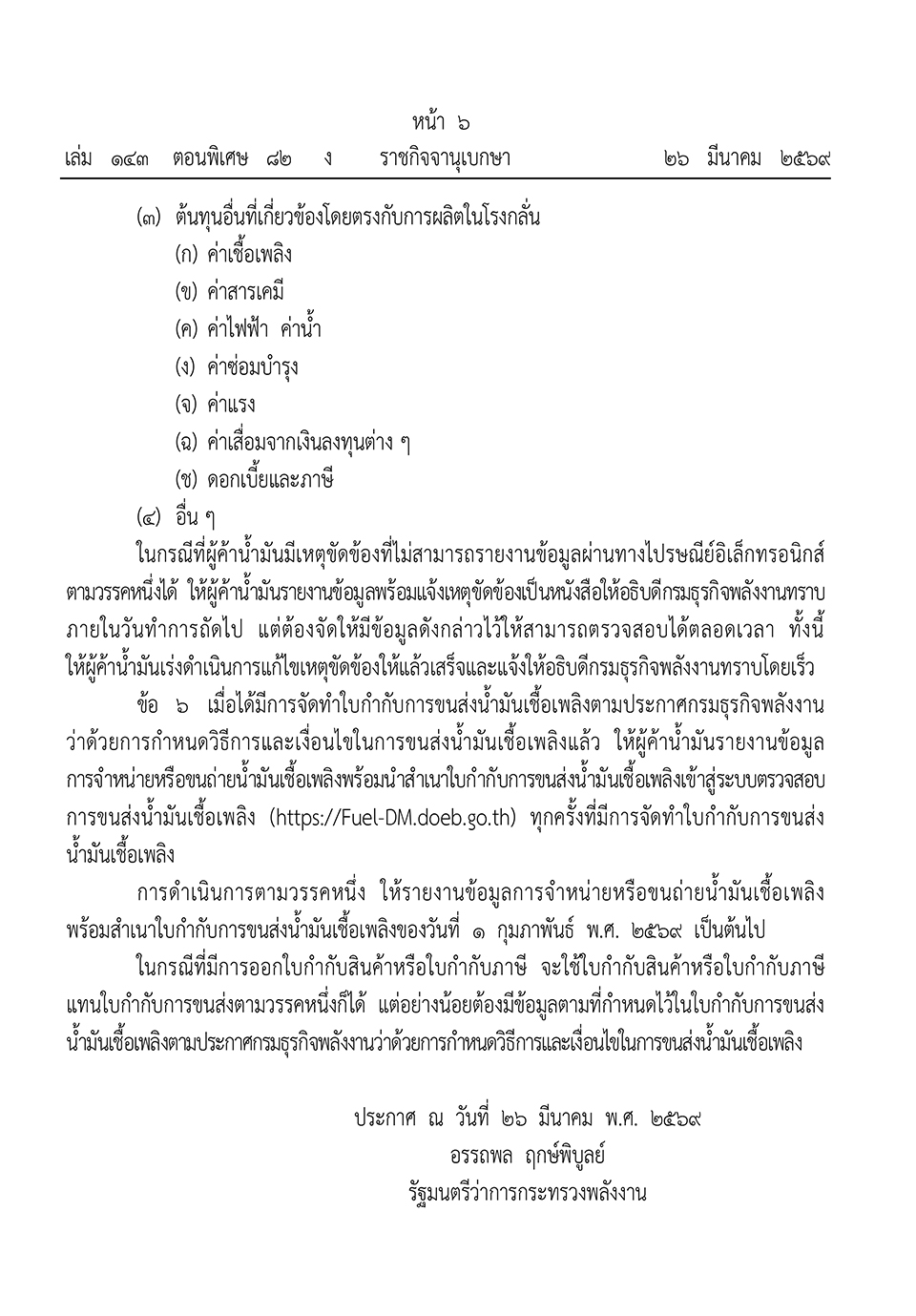 ประกาศดังกล่าว ลงนามโดย อรรถพล ฤกษ์พิบูลย์ รัฐมนตรีว่าการกระทรวงพลังงาน และมีผลบังคับใช้ตั้งแต่วันที่ประกาศในราชกิจจานุเบกษาเป็นต้นไป