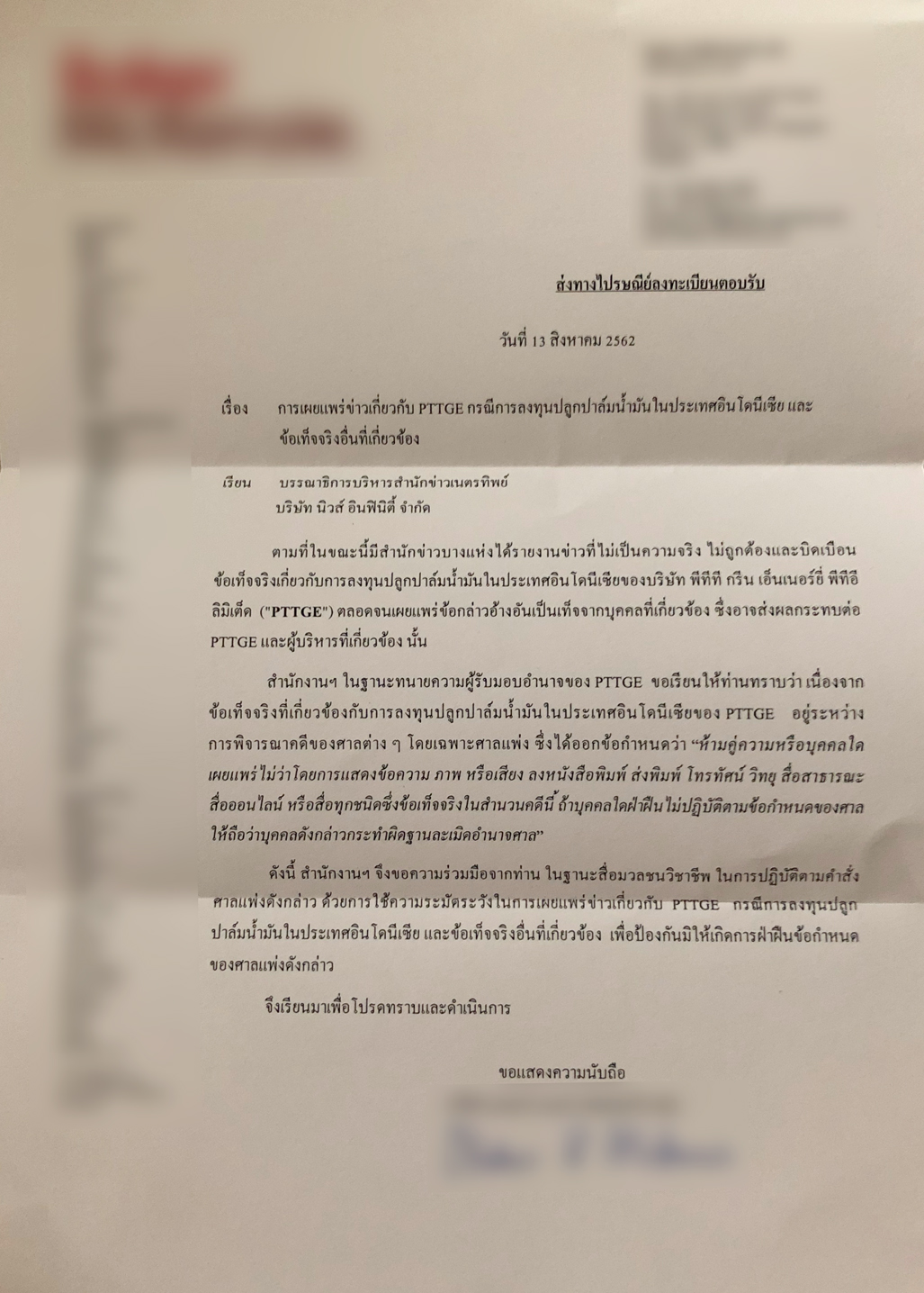 ตรงกันข้าม การที่ผู้บริหาร พีทีทีจีอี เห็นข่าวนี้แล้วทึกทักเอาว่า ทั้งหมดล้วนเกี่ยวพันกับข้อมูลในสำนวนคดีปาล์มอินโดฯ ที่บริษัทมีการยื่นฟ้องเรียกค่าเสียหายทางแพ่งเอากับอดีตผู้บริหารตนเอง และศาลแพ่งได้มีคำสั่งห้ามคู่ความหรือใครก็ตามออกมาให้ข่าวหรือนำเอาข้อความที่ปรากฏอยู่ในสำนวนคำฟ้องไปเผยแพร่ทางสื่อไม่ว่าทางใดนั้น